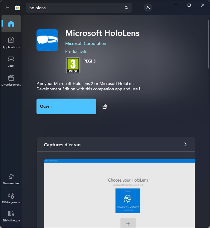 Pour partager ce que vous vivez dans le casque, vous devez télécharger et installer sur votre ordinateur l’application Microsoft Hololens disponible sur le Microsoft Store.
