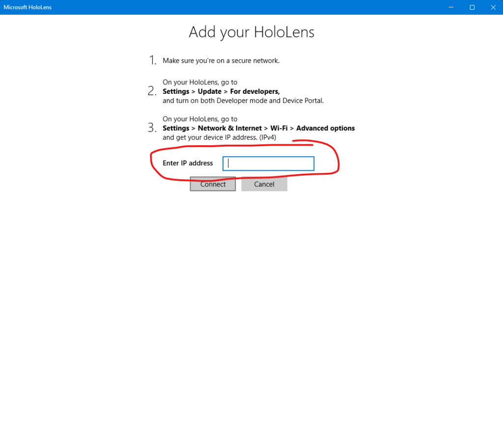 – Renseigner dans l’application Microsoft HoloLens sur l’ordinateur, l’adresse IP affichée dans le casque, puis cliquer sur « Connect ».