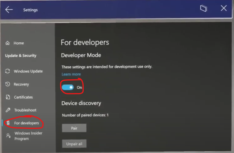 – Allez dans votre Hololens, puis dans les paramètres, ensuite dans la rubrique « Mise a jour » , et enfin « Developpeur » : Ici vous devez activer les options « Developer mode » et « Device Portal » (Mode developpeur et portail d’appareil).